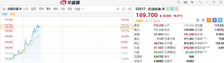 港股生物技术股盘中上扬,药捷安康-B涨超16%,昭衍新药涨超7%,轩竹生物-B涨超5%。