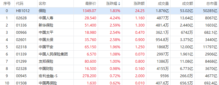 港股保险股午后涨幅扩大,中国人寿涨超4%,新华保险、中国太平涨超2%,中国平安涨近2%。