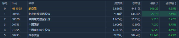 航空股午后涨幅扩大,截至发稿,首都机场、东方航空涨超7%,中国国航、南方航空涨超4%。