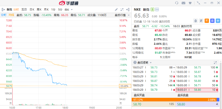 华盛资讯12月19日讯,截至发稿,耐克盘后跌超10%,2026财年Q2营收124.27亿美元,同比增长0.6%,归母净利润7.92亿美元,同比下滑31.9%。