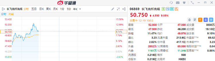长飞光纤光缆涨超9%,近三个交易日累涨逾30%。截至发稿,涨9.85%,报50.75港元,成交额19.18亿港元。