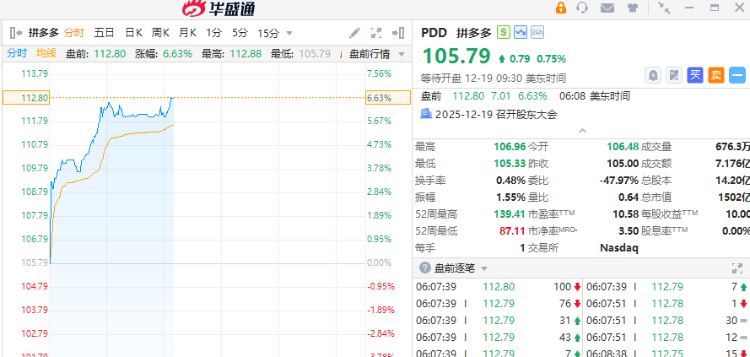 12月19日,拼多多集团(PDD.US)盘前涨幅持续扩大,截至发稿大涨超6%。