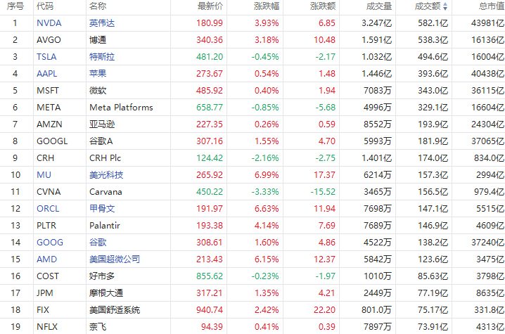 第2名博通收高3.18%,成交533.48亿美元。该股本周累计下跌5.44%,本月迄今下跌15.54%。特鲁斯特证券将博通目标价从500美元上调至510美元。