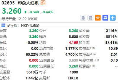 华盛资讯12月22日讯,港股印象大红袍今日挂牌,截至发稿跌9.44%,报3.26港元/股,中签一手账面浮亏340.0港元,最新总市值超4.70亿港元。该股此前公开发售获3397.48倍认购,一手中签率0.8%。