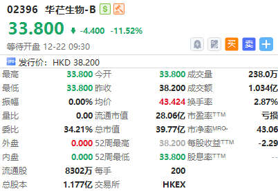 港股华芢生物-B今日挂牌,截至发稿跌11.52%,报33.80港元/股,中签一手账面浮亏880.0港元,最新总市值超39.77亿港元。该股此前公开发售获791.95倍认购,一手中签率2.5%。