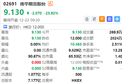 港股南华期货股份今日挂牌,截至发稿跌23.92%,报9.13港元/股,中签一手账面浮亏1435.0港元,最新总市值超65.53亿港元。