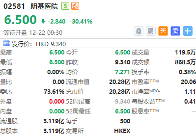 港股明基医院今日挂牌,截至发稿跌30.41%,报6.50港元/股,中签一手账面浮亏1420.0港元,最新总市值超20.28亿港元。