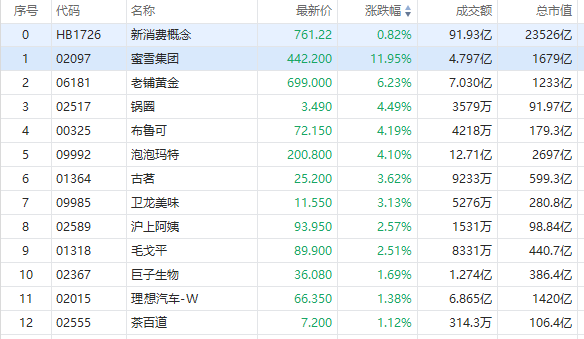 港股市场新消费概念股走强,其中,蜜雪集团涨超12%,老铺黄金涨超6%,锅圈、布鲁可、泡泡玛特涨超4%,古茗、沪上阿姨、毛戈平、卫龙美味涨超2%。