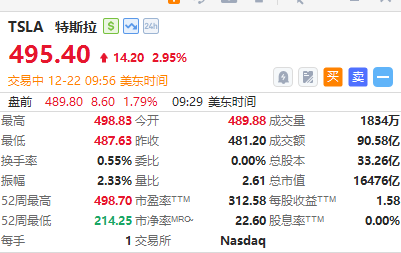 华盛资讯12月22日讯,特斯拉股价盘初涨近3%,高见498.83美元刷新历史新高,最近120个交易日涨幅累计达57%,最新总市值高达1.65万亿美元。