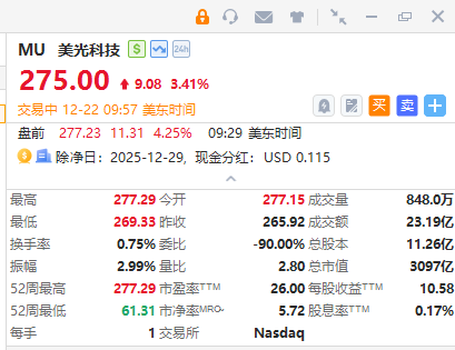 美光科技(MU.US)盘初涨超3.4%,报275美元刷新上市新高价。消息上,华泰证券维持美光科技(MU.US)“买入”评级,目标价360美元;FY26Q1营收利润超预期,AI驱动HBM及DRAM需求高增,毛利率显著提升。公司上调资本支出至200亿美元,HBM4良率爬坡加快,SOCAMM2先发优势明显。NAND受益于AI服务器SSD扩容。盈利预测大幅上调,切换至15.0x FY26E PE估值,目标价升至360美元。