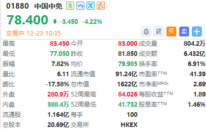 中国中免昨日暴涨逾15%,今日回落逾4%,截至发稿,跌4.22%,报78.4港元,成交额6.432亿港元。