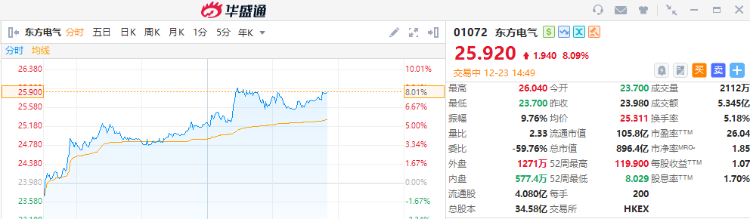 东方电气午后持续走高,截至发稿,涨超8%,报25.92港元,成交额5.345亿港元。