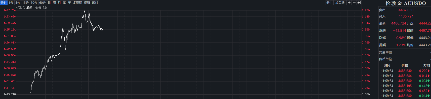 截至12月23日上午12时,伦敦金价格最高达4497.75美元/盎司,创历史纪录,距离4500美元的关键突破位仅一步之遥;COMEX黄金期货价格已突破4530美元/盎司。