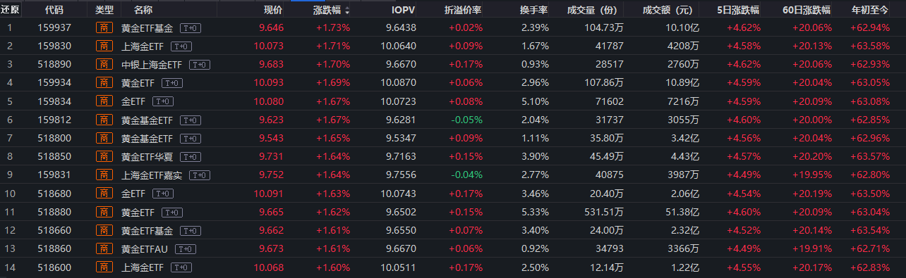 受资金驱动影响,截至11时30分收盘,14只商品黄金ETF中,有12只都出现了溢价。其中上海金ETF(518600.SH)、金ETF(518680.SH)及中银上海金ETF(518890.SH)折溢价率靠前,均达0.17%。