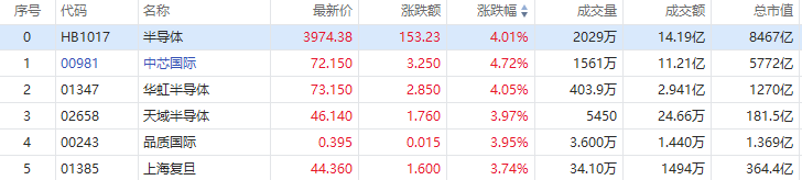 港股半导体股盘初走高!中芯国际、华虹半导体涨超4%,上海复旦涨超3%。