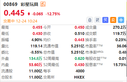 彩星玩具跌超12%,“忍者龟”产品特许权协议2027年起将不获续期。