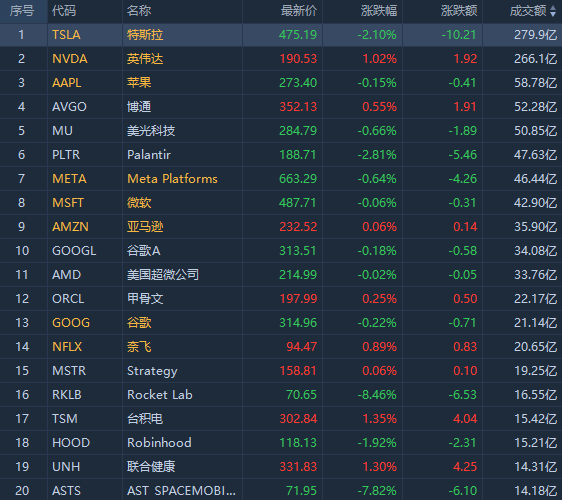 第3名苹果收跌0.15%,成交58.73亿美元。根据公开资料,2025年11月苹果等外资品牌智能手机在华出货量同比飙升128.4%,同期中国整体智能手机市场仅微增不到2%,苹果增速领先行业逾60倍。苹果管理层在业绩展望中预计,2025年假日季公司营收将同比增长10%,并有望带动全年收入进一步抬升。