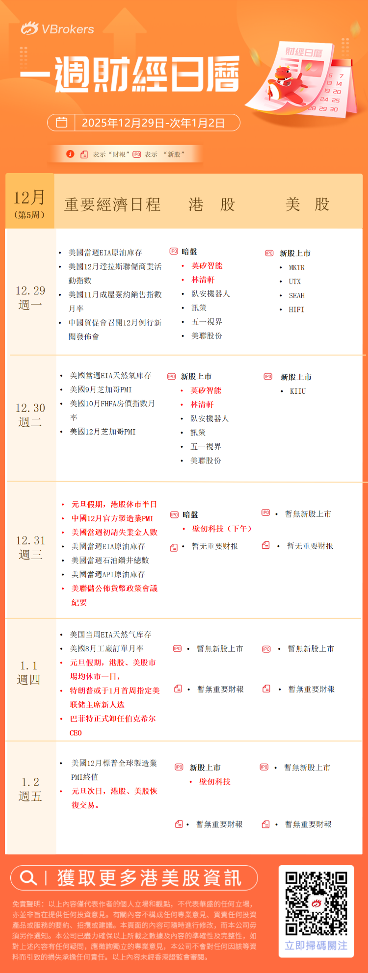 展望下周,港股及美股暂无重要财报发布,经济数据可关注下周三将发布的初请失业金数据;同日凌晨3点,美联储将公布货币政策会议纪要。下周,中国将于周三公布制造业及非制造业PMI数据。值得注意的是,消息称特朗普或于1月首周指定美联储主席新人选,白宫经济顾问哈塞特及前美联储理事沃什为热门人选。巴菲特将于2025年年底正式卸任伯克希尔CEO,阿贝尔将接任。另外,下周四将迎来元旦假期,港股将于周三午时起休市一天半,美股周四休市一天。