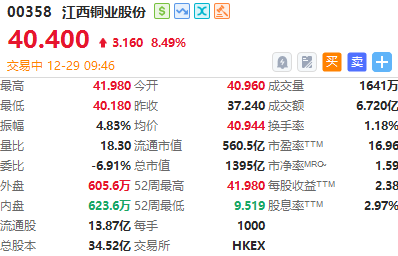 江西铜业股份高开近10%,截至发稿,涨超8%,报40.4港元,成交额6.72亿港元。
