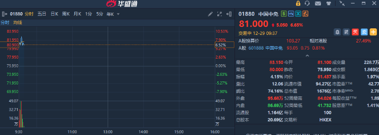 华盛资讯12月29日讯,港股中国中免早盘高开近7%,截至发稿,股价上涨6.65%,现报81港元,成交额9900.30万港元。