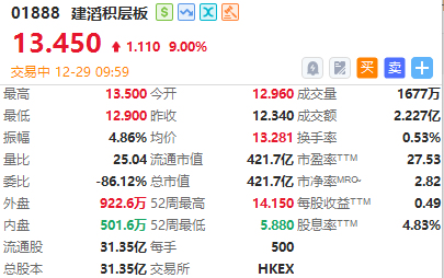 建滔积层板涨9%,截至发稿,报13.45港元,成交额2.227亿港元。