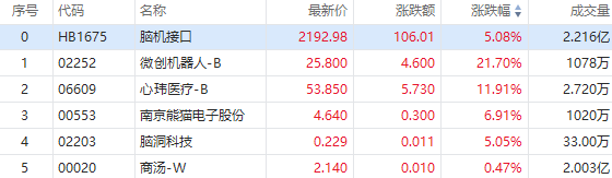 脑机概念股早盘走强,截至发稿,微创机器人涨超21%,心玮医疗-B涨近12%,南京熊猫电子股份涨近7%,脑洞科技涨超5%,脑动极光-B涨超4%。