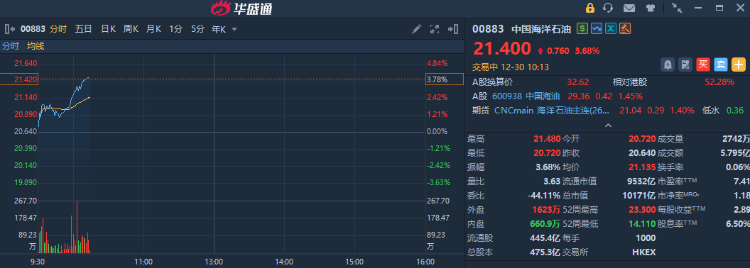 华盛资讯12月30日讯,港股石油股盘中走强,中国海洋石油涨近4%,中国石油股份涨超2%,中国石油化工股份涨近1%。