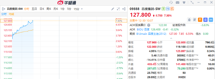 百度集团-SW涨超7%,截至发稿,涨7.3%,报127.8港元,成交额9.968亿港元。