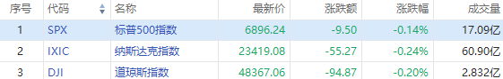 昨夜今晨,美股三大指数连续第三个交易日以集体微幅下跌收盘。截至收盘,标普500指数跌0.14%,纳斯达克综合指数跌0.24%,道琼斯工业平均指数跌0.2%。此外,若今晚不跳水,标普500指数将携“月线8连涨”的姿态进入2026年,这也是该指数自2017年以来最长的连涨状态。