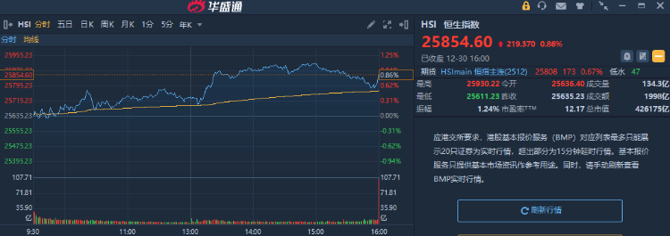 12月30日消息,港股三大指数震荡走高。截至收盘,恒生指数涨0.86%,报25854.60点,恒生科技指数涨1.74%,国企指数涨1.12%。盘面上,科网股普涨,百度涨超8%,网易、小米涨超2%;半导体板块强势,英诺赛科涨超15%;机器人概念股走高,越疆涨超13%;石油股涨幅居前,中海油涨超3%;今日6只新股上市。