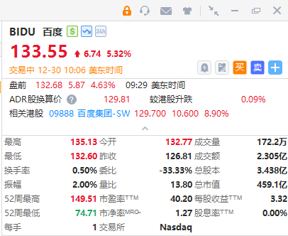 百度美股大涨超5%!AI业务多点开花,内化AI能力进入集中兑现期。