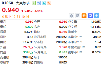 电影概念股多数上涨,截至发稿,大麦娱乐涨4.44%,报0.94港元;中国星集团涨4.42%,报2.6港元;猫眼娱乐涨1.93%,报6.86港元。