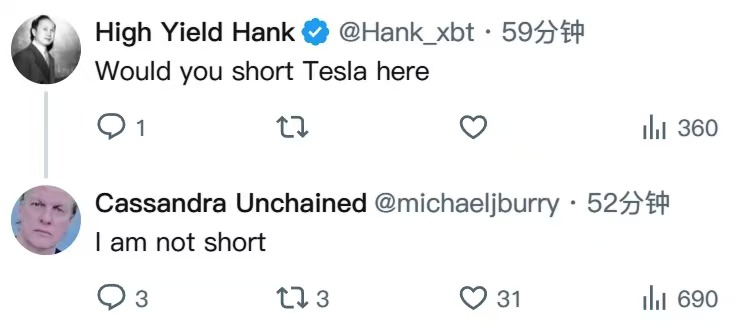 不过,在另一篇帖子中,Burry回应一位用户有关他是否将做空特斯拉的提问时表示,“我没有做空”。