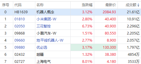 1月2日讯,港股机器人概念继续走高,截至发稿,三花智控涨超6%,上海电气涨超8%,优必选涨超3%,地平线机器人-W涨超2%。
