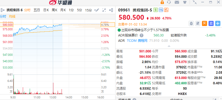 携程集团-S(09961)盘中涨近5%,截至发稿,涨4.33%,报578港元,成交额4.24亿港元。