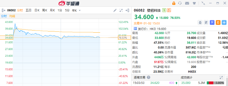 “港股GPU第一股”壁仞科技今日上市,成为2026年港股市场首只上市新股。壁仞科技早盘高开后,涨幅一度超过100%,上午收盘涨72.86%。