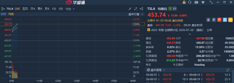 华盛资讯1月5日讯,道指盘中创下历史新高,现涨近1.2%。美股大型科技股普遍上涨,特斯拉盘中涨超3%,亚马逊涨超2%,Meta涨超1%,英伟达、谷歌小幅上涨;唯苹果逆势跌近1%。