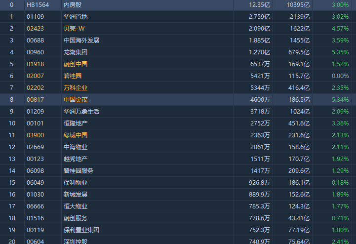 内房股延续昨日上涨,截至发稿,中国金茂、龙湖集团涨超5%,贝壳-W涨超4%,华润置地涨超3%。