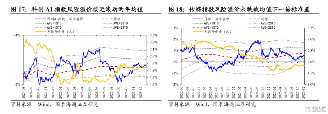 AI应用:估值性价比较高,关注互联网与传媒。当前以科创AI指数衡量的AI应用端风险溢价接近滚动两年均值,显示板块仍具有较高的估值性价比。但应用侧投资难点在于爆款出现的时间与领域难以预测,但港股互联网平台型企业确定性受益,A股趋势性行情需较高的证券化率支持,传媒行业最值得关注。(详见国泰海通策略报告《从移动互联网行情看当下AI投资》)。