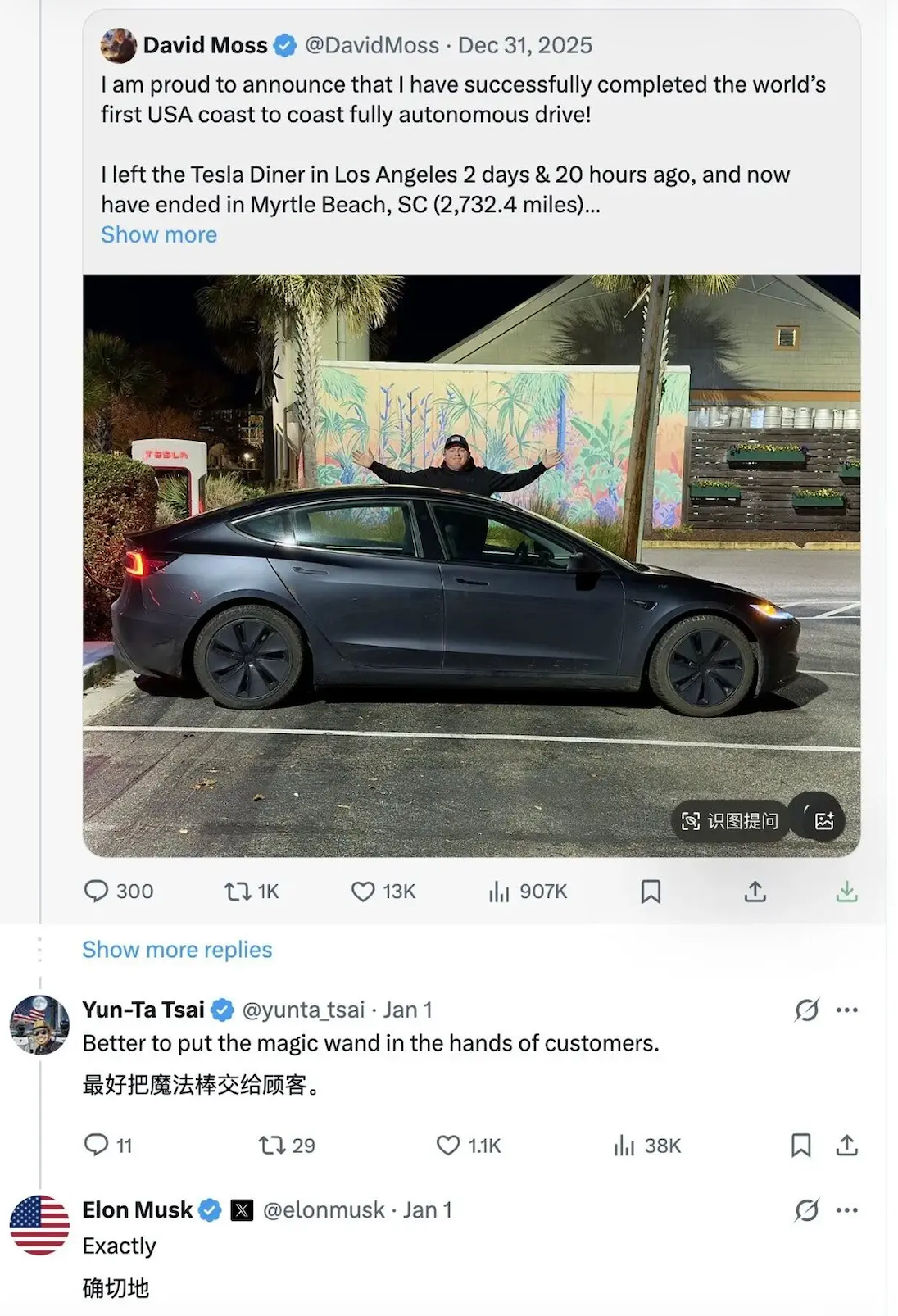 近期,国外用户使用特斯拉FSD V14.2版本从洛杉矶特斯拉餐厅全程自动驾驶到南卡罗来纳州默特尔比奇。用时50个小时,行驶了约4397.4公里,贯穿美国东西海岸,即便是进入特斯拉超充站的情况也没有接管。