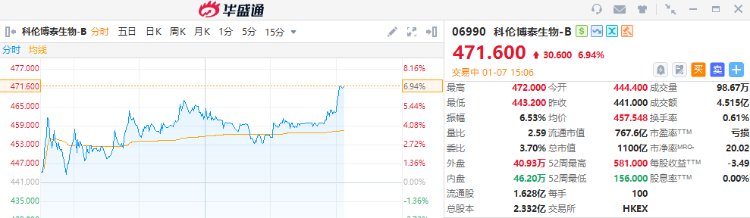 港股创新药概念股午后持续走高,科伦博泰生物-B涨近7%,康方生物涨超6%,三生制药、信达生物、药明生物涨超5%,药明康德涨超4%。