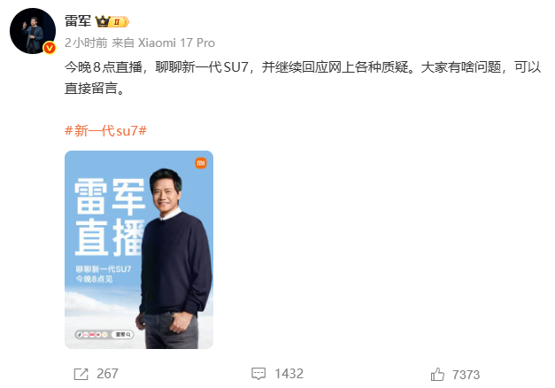 华盛资讯1月7日讯,小米集团创始人、执行董事、董事长及首席执行官雷军,发布微博称:“今晚8点直播,聊聊新一代SU7,并继续回应网上各种质疑。大家有啥问题,可以直接留言。”
