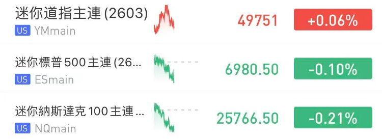华盛资讯1月7日讯,盘前美股三大股指期货涨跌不一,截至发稿,纳指期货 $NQmain 跌0.21%,标普500期货 $ESmain 跌0.10%,道指期货 $YMmain 微涨0.06%。