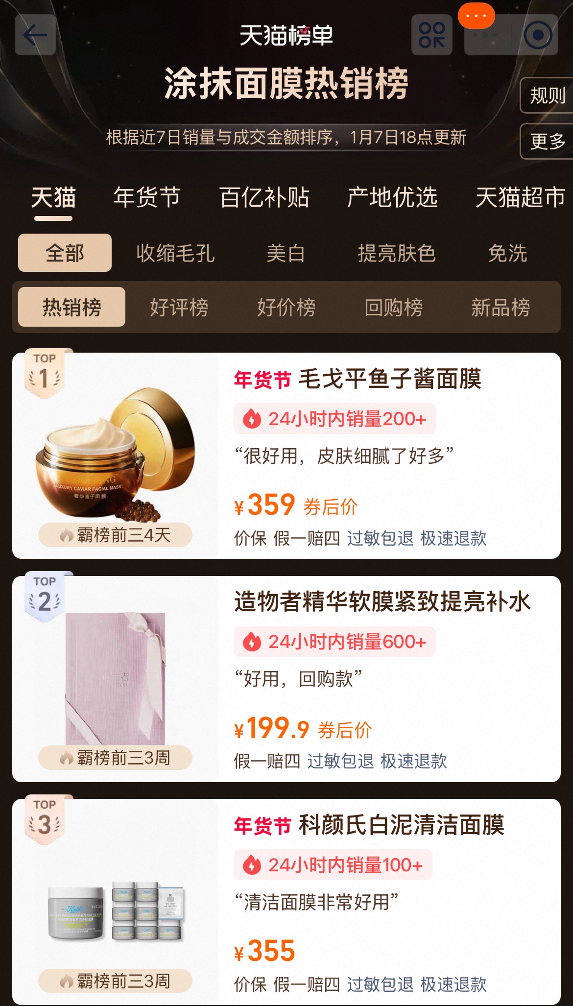 据诺斯贝尔联合用户说发布的《2025中国面膜市场创新与全球消费趋势白皮书》(以下简称“报告”)显示,2024年2月至2025年1月,天猫平台销售额前三的涂抹面膜分别是毛戈平鱼子酱面膜、造物者精华软膜和科颜氏白泥清洁面膜——国货品牌占据两席,仅科颜氏一款经典清洁面膜守住外资阵地。截至2026年1月7日18时,天猫榜单中的涂抹面膜热销榜(根据近7日销量与成交额排序),这三款面膜依然位列前三。其中,销量最好的毛戈平鱼子酱面膜售价为420元/30g,功效标注为紧致饱满、维稳焕亮和细腻抚纹。目前,天猫毛戈平官方旗舰店显示该款面膜的销量已超10万+,远超菲洛嘉核心单品“十全大补”面膜。菲洛嘉天猫旗舰店显示,销量最高的产品是售价19.9元的15ml“十全大补面膜2.0进阶版”,销量仅1万件。