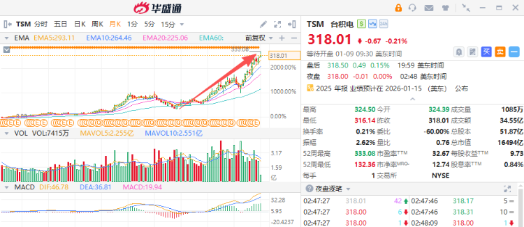 作为全球最大的芯片代工制造商,在全球AI热潮下,几乎垄断的行业地位获得投资者持续追捧。公司股价2025年再涨56%,过去三年累计涨幅超过两倍;而2026年开年至今,该股涨幅已达5%。