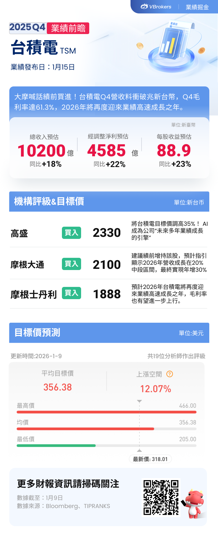 摩根士丹利认为公司营收和利润率具有增长潜力,并建议投资者在2026年初之前增持该股。预计台积电将在指引中显示2026年营收增长在20%中段区间,最终实现同比增长30%;并预计公司在2025年第四季度毛利率将突破60%,2026年全年保持在60%以上。
