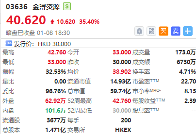 华盛资讯01月08日讯,港股金浔资源暗盘收涨35.40%,报40.62港元/股,中签一手账面浮盈2124.0港元,最新总市值超59.74亿港元。