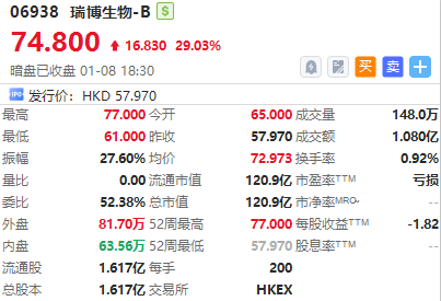 港股瑞博生物-B暗盘收涨29.03%,报74.80港元/股,中签一手账面浮盈3366.0港元,最新总市值超120.94亿港元。