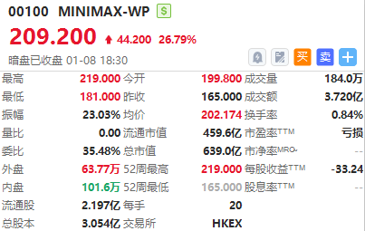 港股MINIMAX-WP暗盘收涨26.79%,报209.20港元/股,中签一手账面浮盈884.0港元,最新总市值超639.00亿港元。