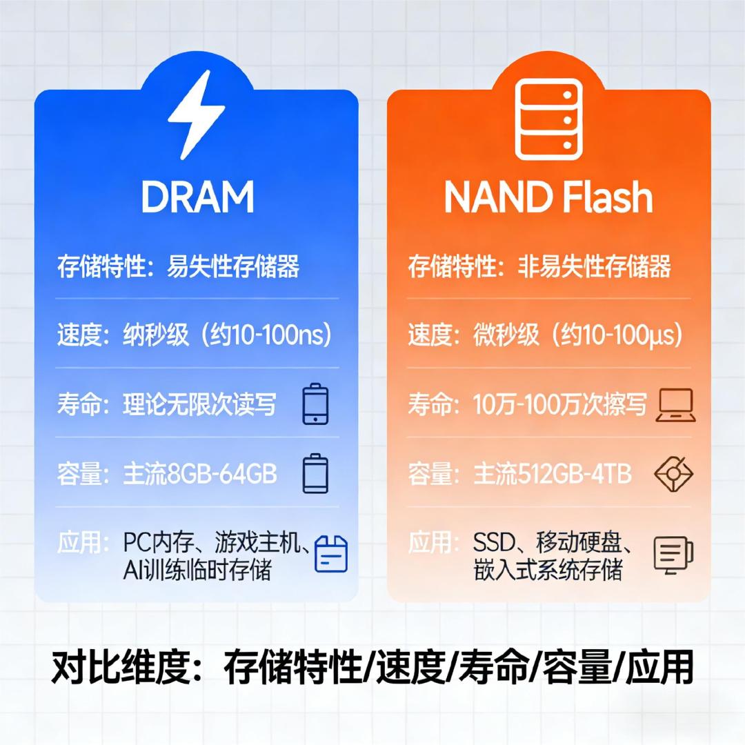 DRAM,相当于你工作的书桌,书桌越大,你能同时处理的工作越多。买手机时,销售讲的8G,12G、16G内存,就是DRAM技术。